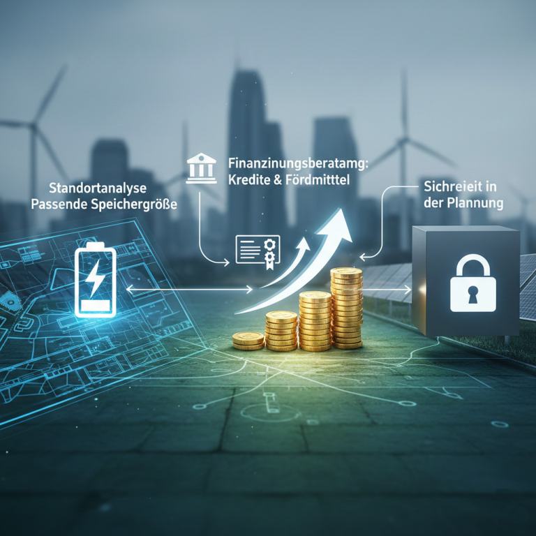 Speicher-Lösungen, die sich auszahlen. Von der Konzeptentwicklung und Standortanalyse bis zur Finanzierungsberatung (Kredite & Fördermittel) – wir schaffen Sicherheit in der Planung und eine optimale Kapitalstruktur für Ihr Energieprojekt.